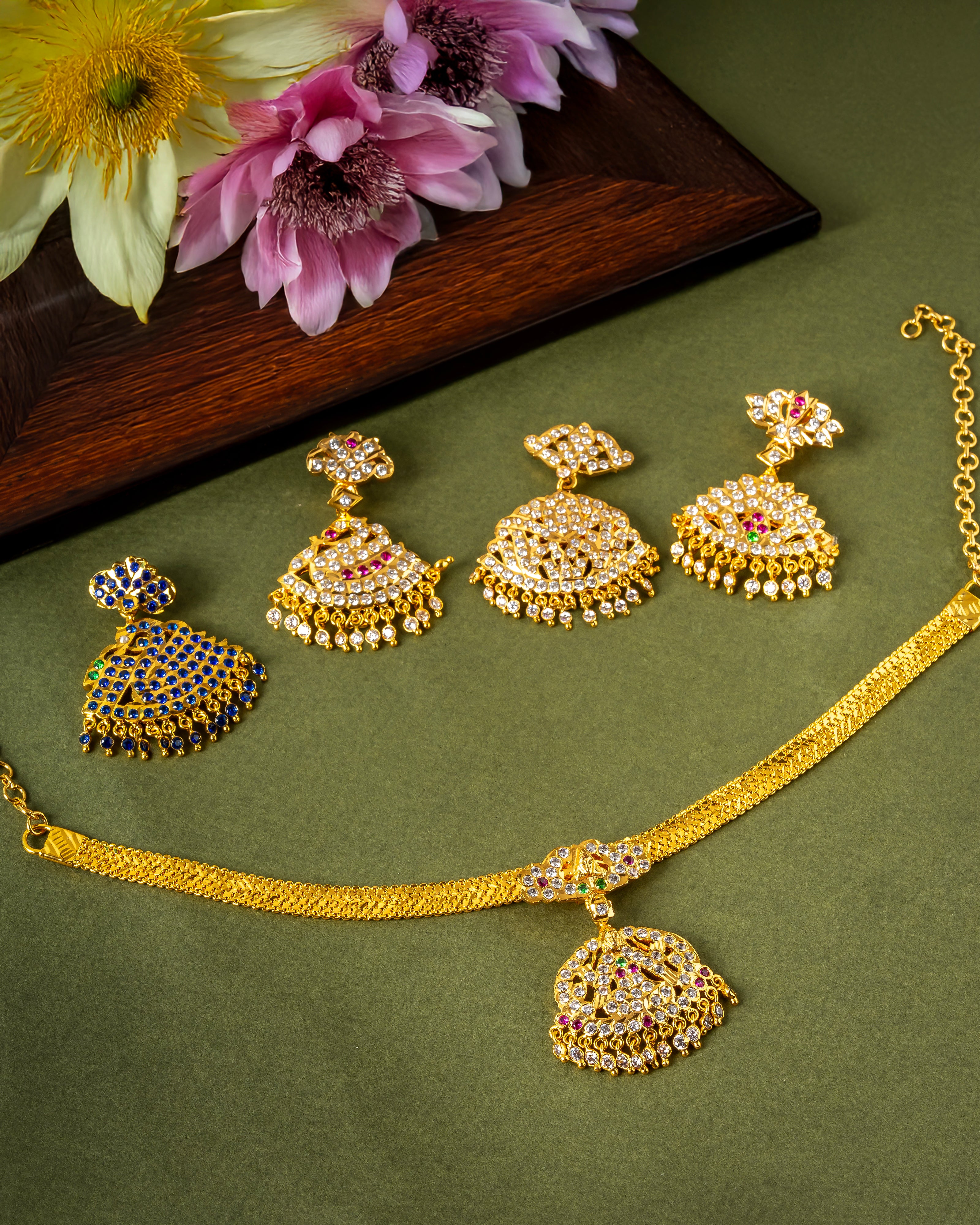 Bridal Antique Choker Necklace with AD Stones, Emerald Stones & Pearl Drops