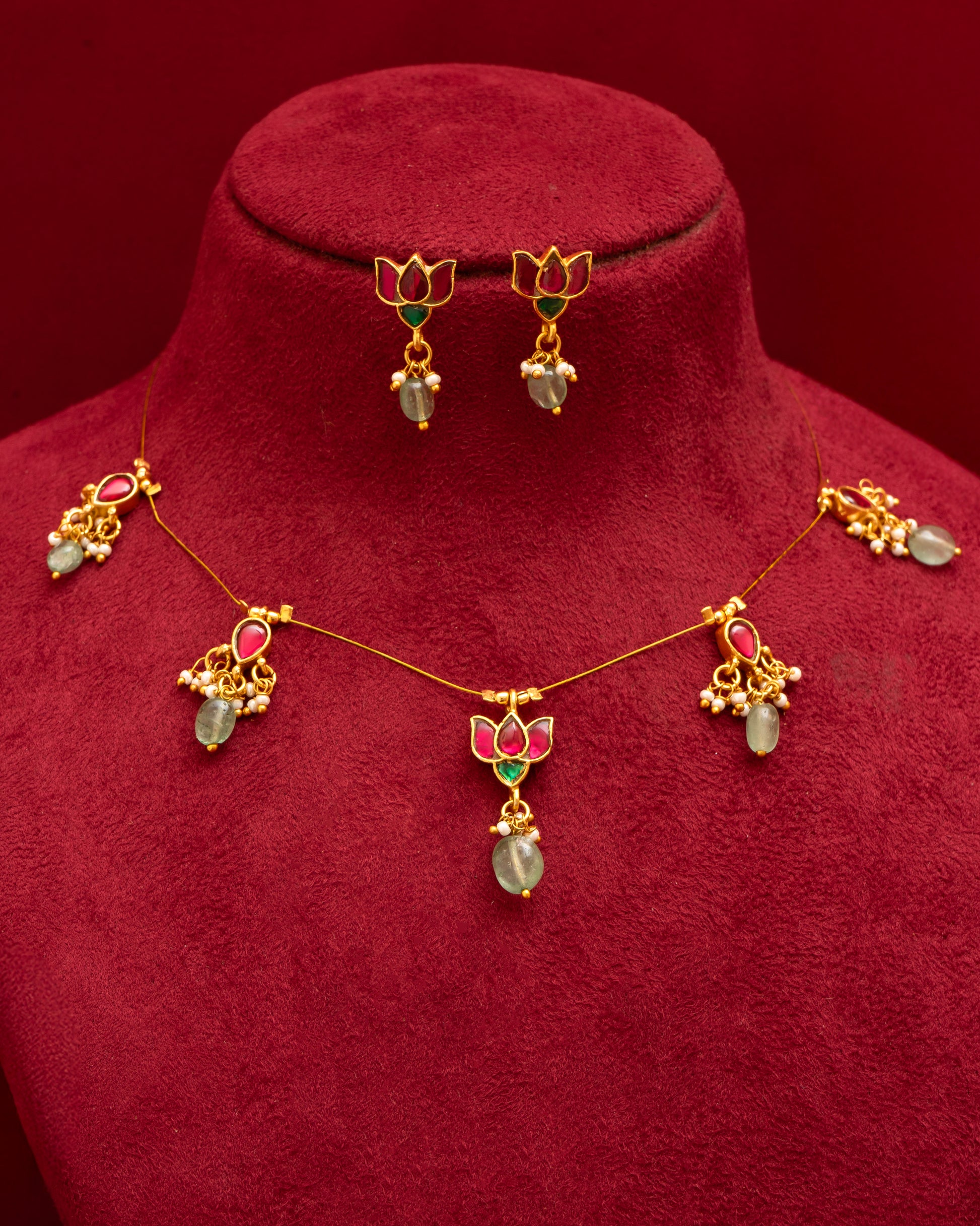 Immerse yourself in the charm of handcrafted heritage jewelry with this delicate Lotus Jadau Necklace Set. The necklace features beautifully designed lotus motifs filled with vibrant jadau stones, paired with strawberry bead drops and mini pearl clusters for an elegant, graceful finish. The thin chain design gives it a modern, lightweight feel while retaining the richness of traditional Rajasthani jadau craftsmanship. The matching lotus earrings complete the set, making it perfect for festive wear,.