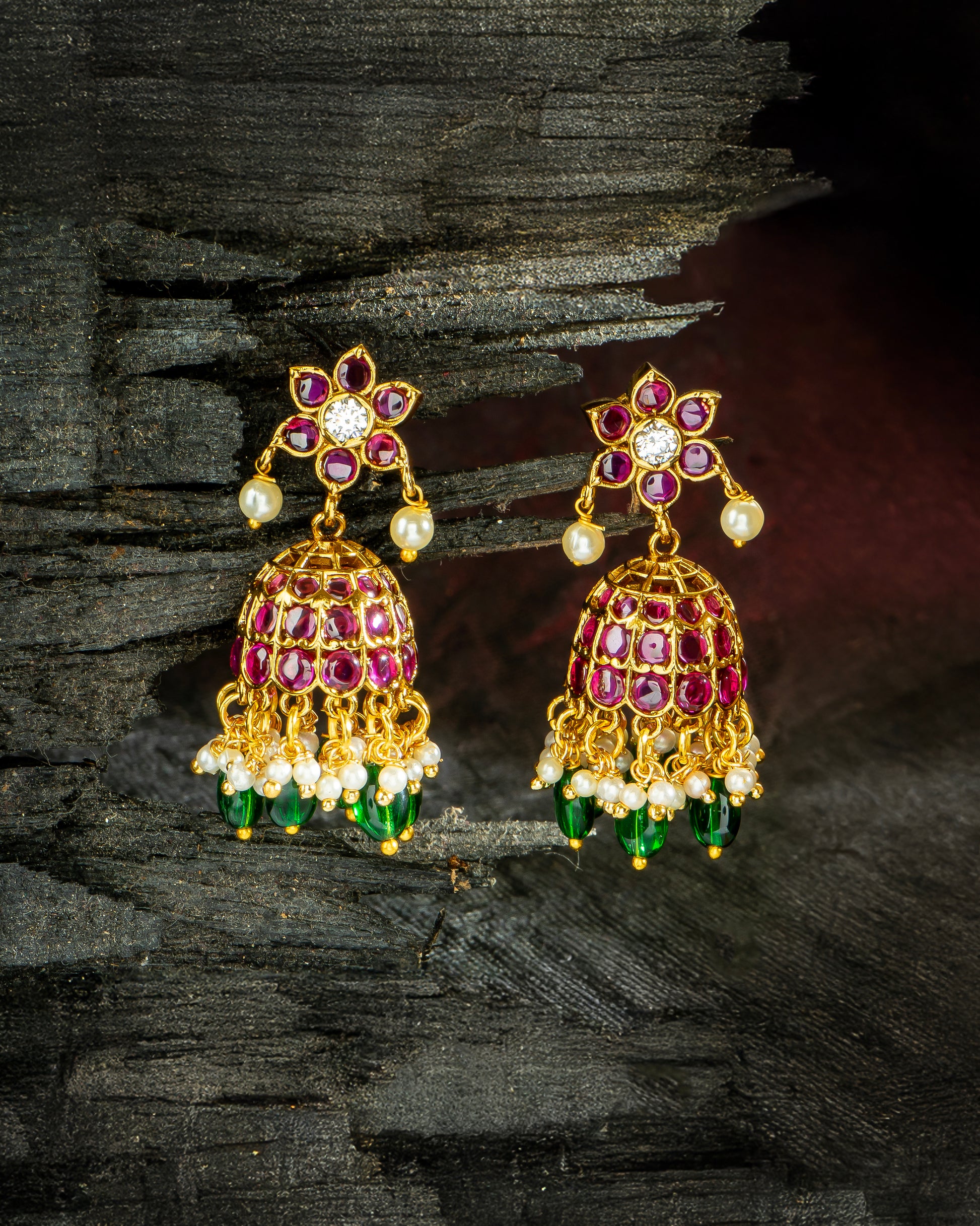 Elevate your ethnic elegance with these stunning Kemp Jhumka Earrings, crafted with intricate detailing and vibrant traditional hues. Featuring rich red kemp stones, sparkling white stones, these earrings highlight timeless Indian craftsmanship. The jhumka is adorned with delicate pearl clusters and green bead hangings, adding graceful movement and festive charm.