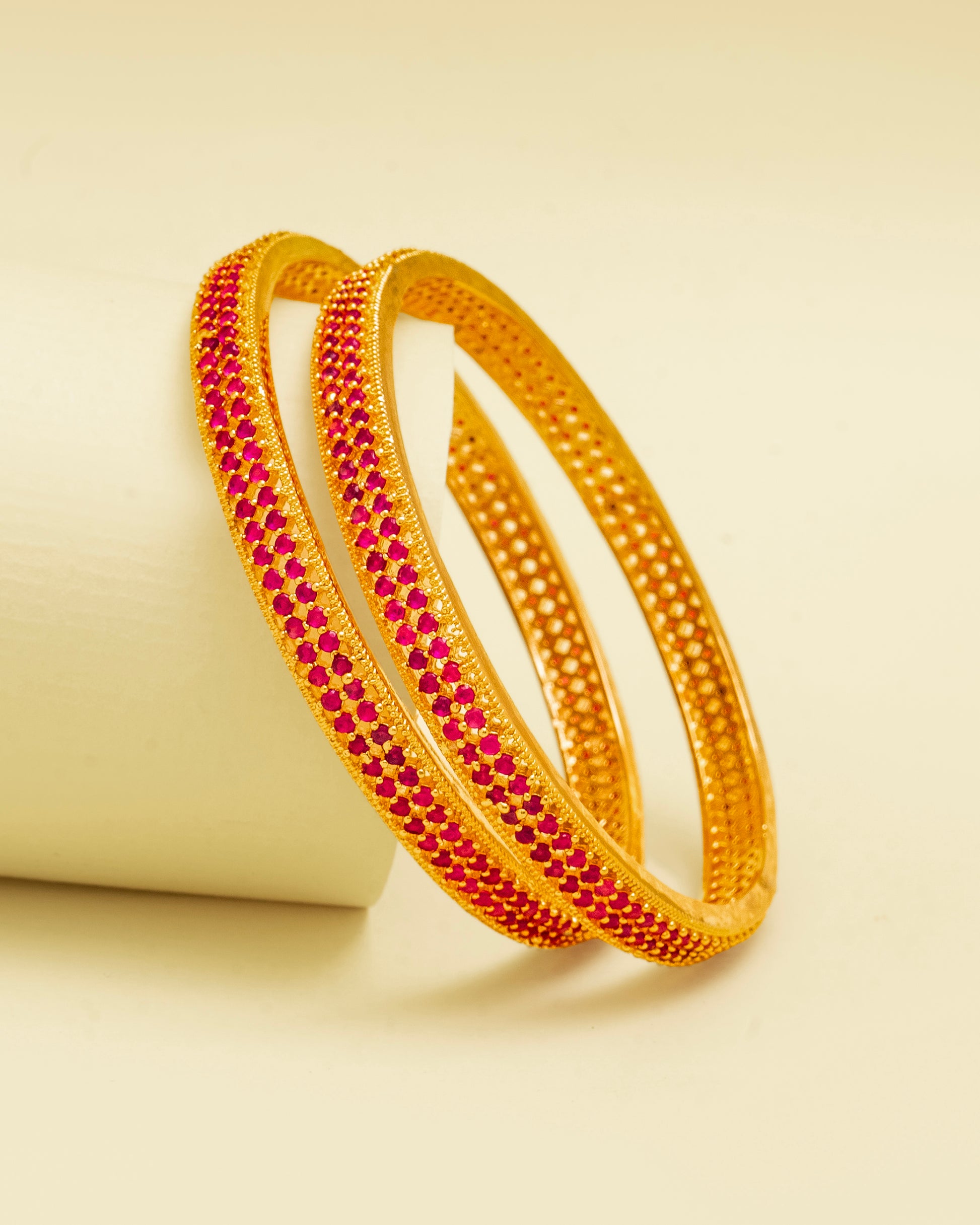 Elevate your everyday and festive look with these beautifully crafted Gold-Tone Pink CZ Stone Bangles. Featuring a fine row of sparkling pink Cubic Zirconia stones set in a sleek and detailed band, these bangles offer a perfect balance of subtle elegance and vibrant charm. The rich gold finish enhances the brightness of the stones, making them ideal for traditional wear, festive dressing, family events, or daily ethnic styling. Lightweight, durable, and timeless, these bangles pair effortlessly with sarees, kurtis and lehengas.